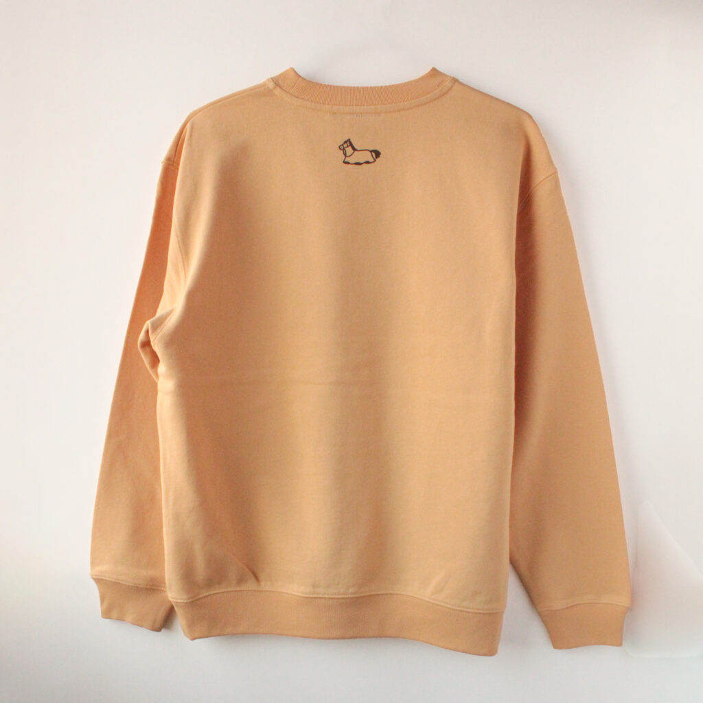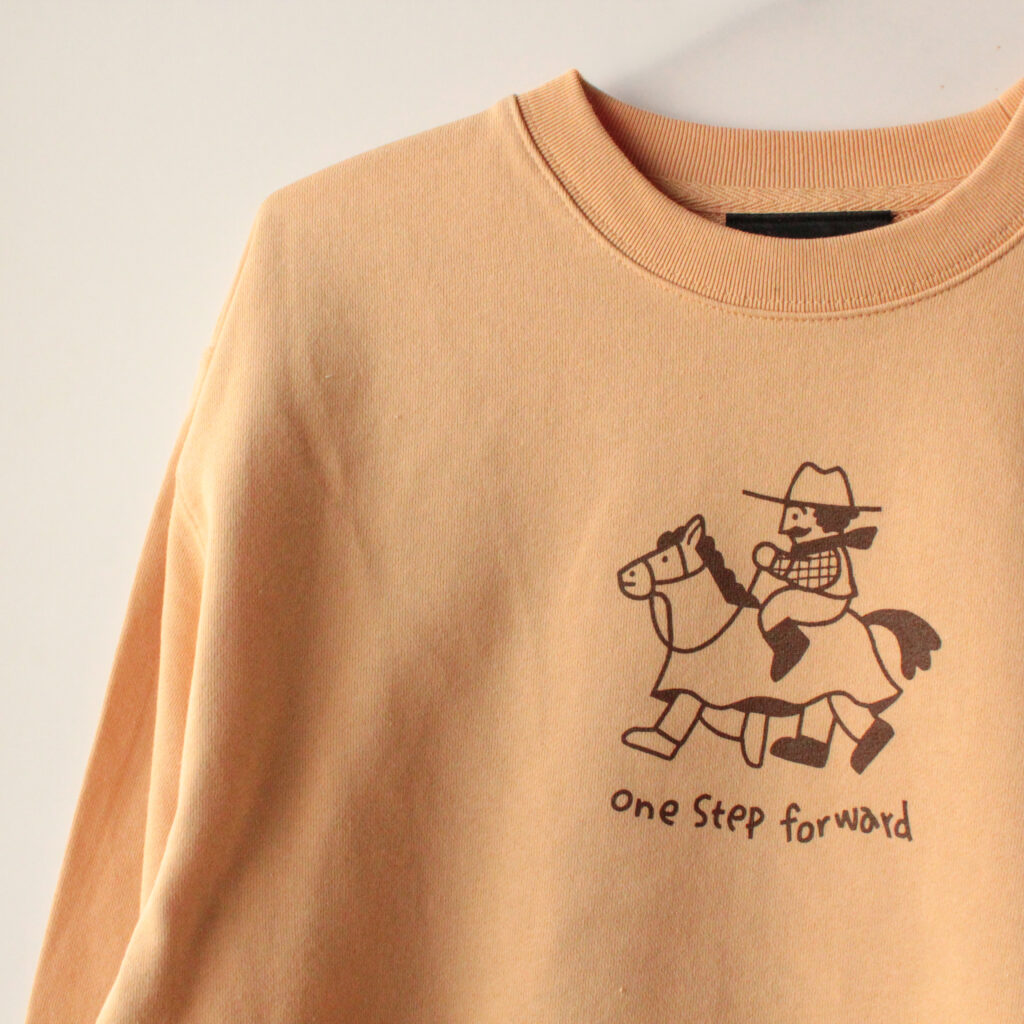 二人で息を合わせて一歩ずつ進む、ぎこちない足取り。そんな“ゆるい前進”をイメージしたスウェットです。